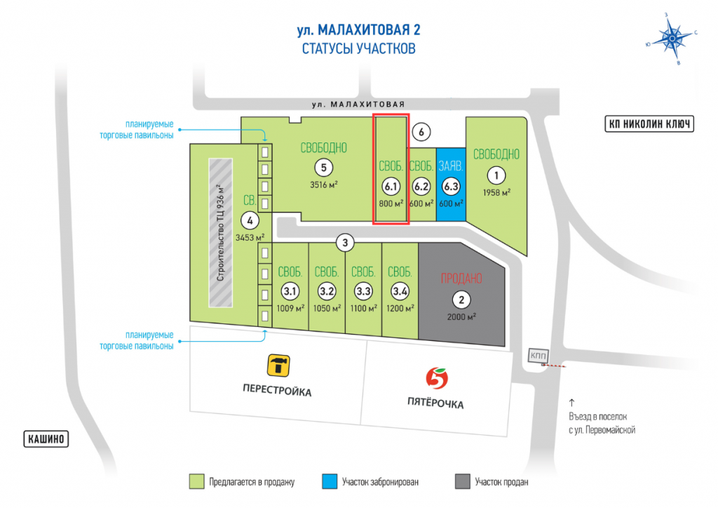 Рядом расположены магазины сетей «Строительный двор» и «Пятёрочка», по соседству — Кашино и коттеджный посёлок «Николин Ключ». Высокий ежедневный трафик.